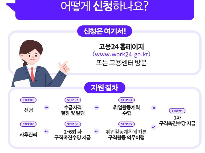 - 지원금(구직촉진수당) 최대 월 50만 원씩 6개월(총 300만 원) 지급