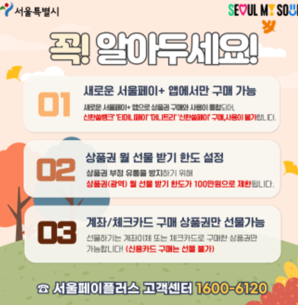: 11월 5일 발행 당일에는 안정적인 시스템 운영을 위해 서울페이플러스 앱의 '가맹점 찾기'와 '상품권 선물하기' 기능이 오전 9시 30분부터 오후 7시까지 일시 중단됩니다.