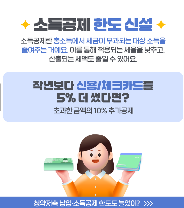 주택청약저축 납입액 공제: 공제 대상 납입 한도가 연 240만 원에서 연 300만 원으로 상향되었습니다. 납입액의 40%를 공제받을 수 있어 최대 120만 원까지 공제가 가능합니다.