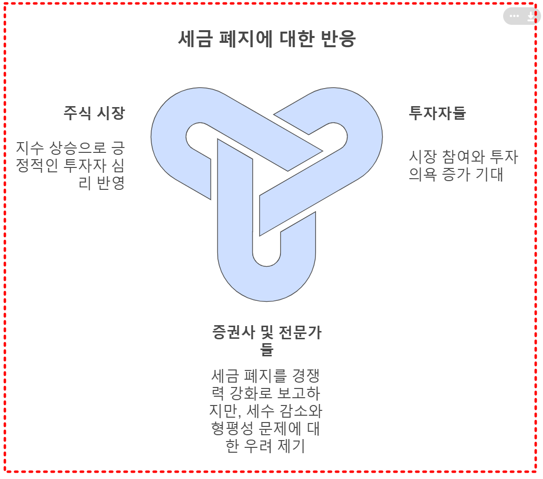금투세 폐지가 국내 금융시장 경쟁력을 강화할 것이라는 긍정적 평가가 많습니다. 하지만 일부 전문가들은 세수 감소와 형평성 문제를 지적하며, 장기적인 재정 안정성을 위한 대책이 필요하다고 언급합니다.
