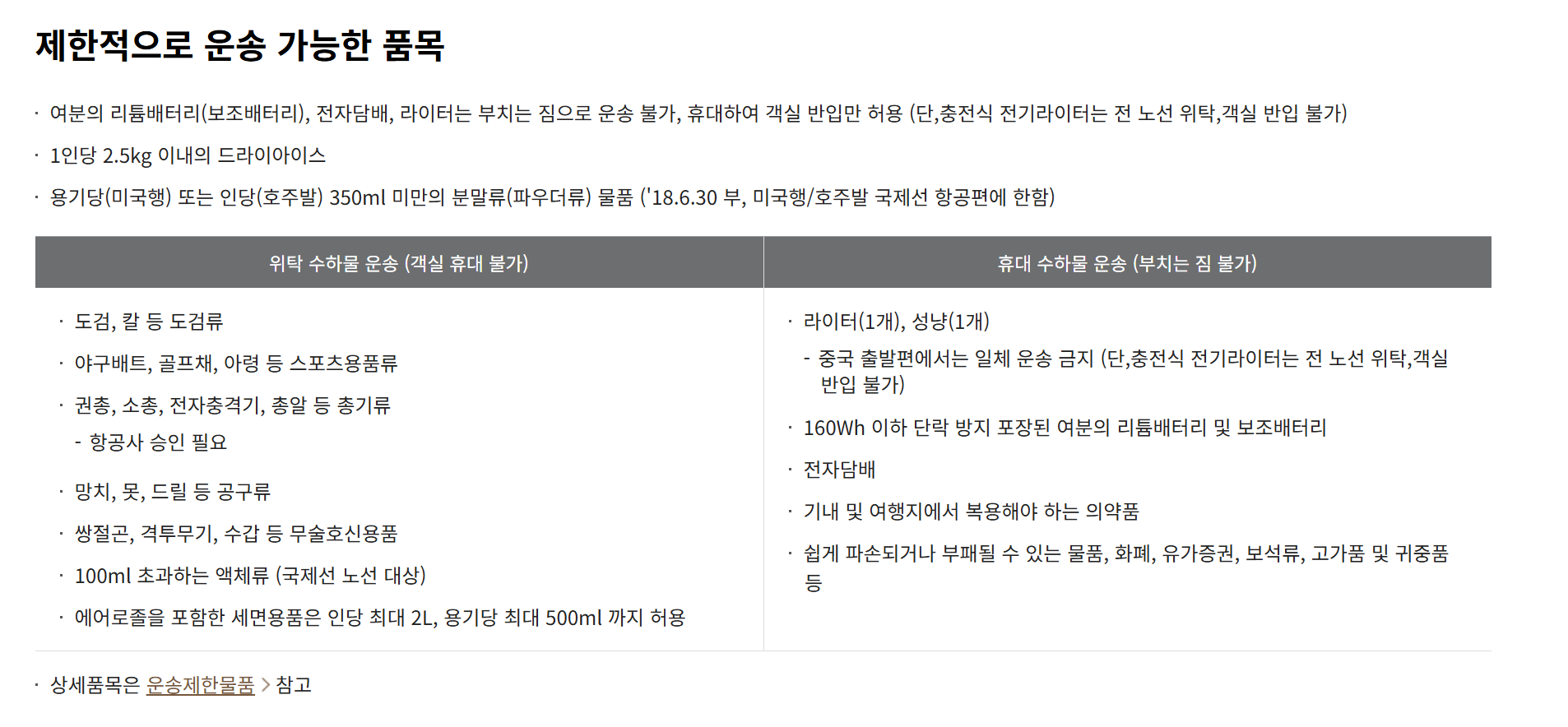 기내 반입 및 수하물 위탁이 제한되는 물품에 대해 안내해 드려요.