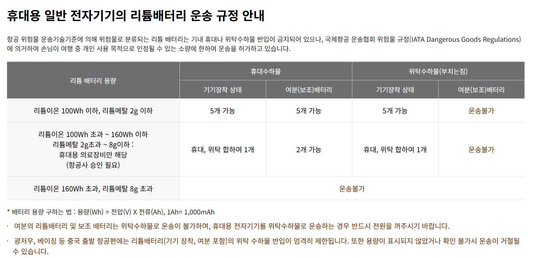 ✅ 100Wh 이하 배터리는 자유롭게 반입 가능