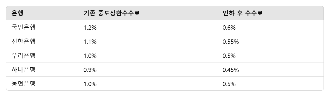 기존에는 대출을 조기 상환하면 최대 1.2%의 수수료가 부과되었지만, 이번 인하 조치로 최대 50% 감면됩니다. 은행별 인하 내용은 다음과 같습니다.