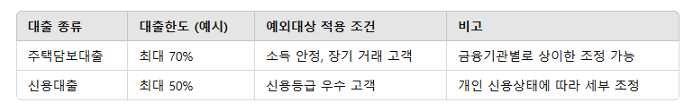 아래 표는 주택담보대출과 신용대출에 적용될 예상 대출한도와 예외대상 기준의 예시를 보여줍니다.